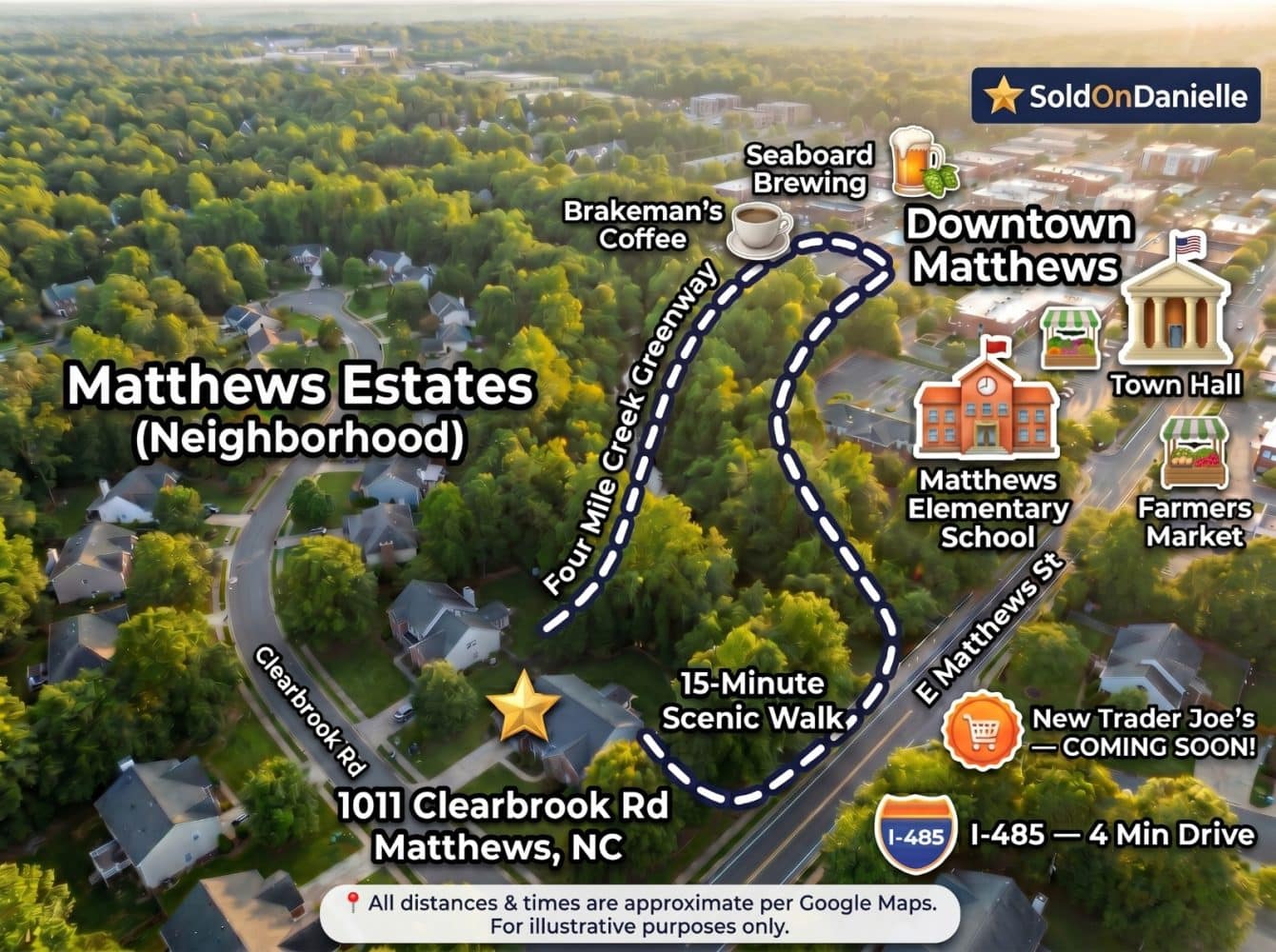 Location that actually works. Being minutes from I-485 keeps everything connected without the constant traffic, density, and pace that comes with living closer in.