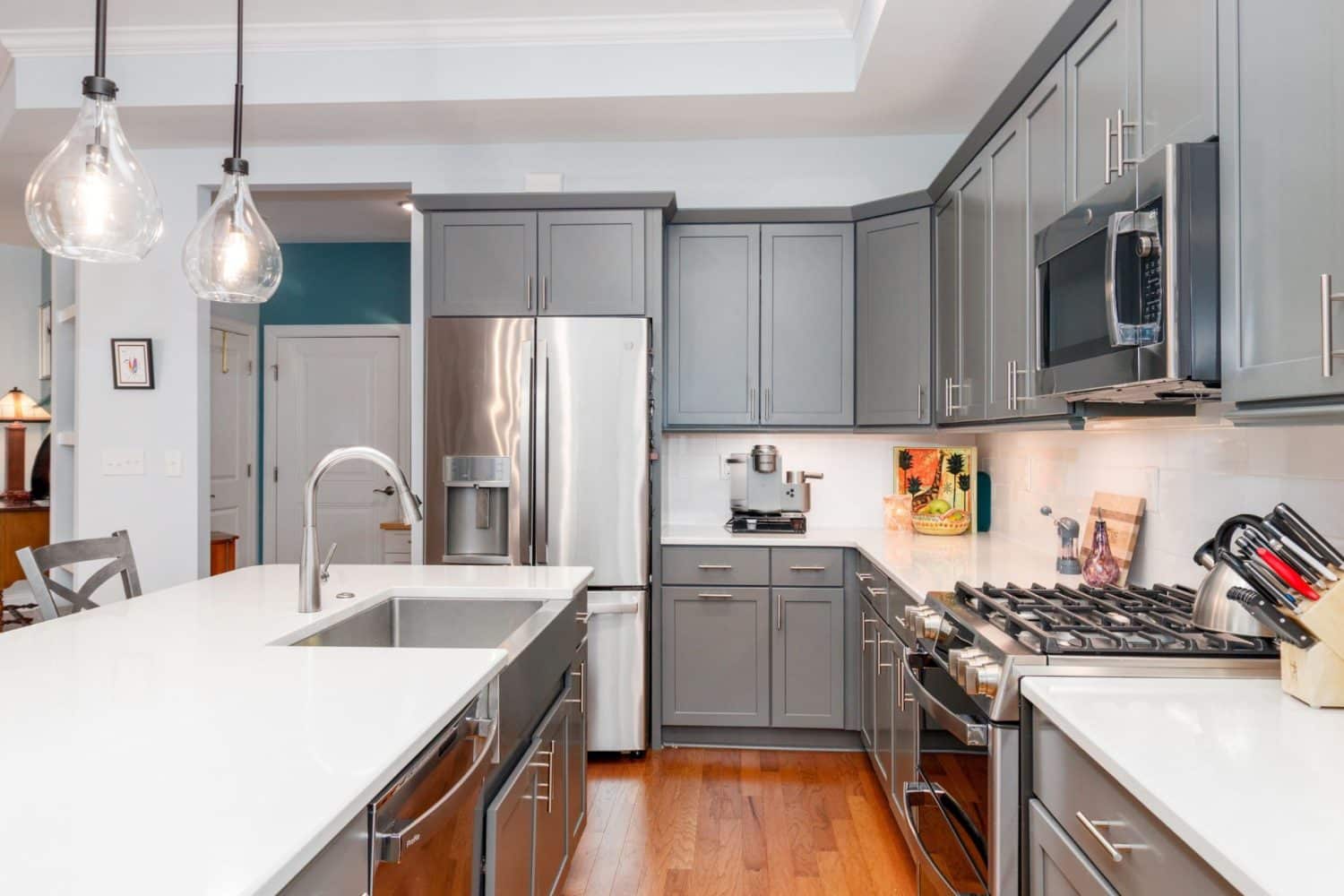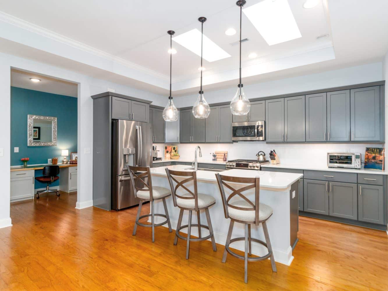 First impressions matter, and this kitchen delivers. Fresh neutral paint with subtle blue accent tones sets the stage, while hardwood floors flow seamlessly throughout the living spaces. In addition, dual skylights flood the kitchen with natural light, creating an inviting and airy feel.