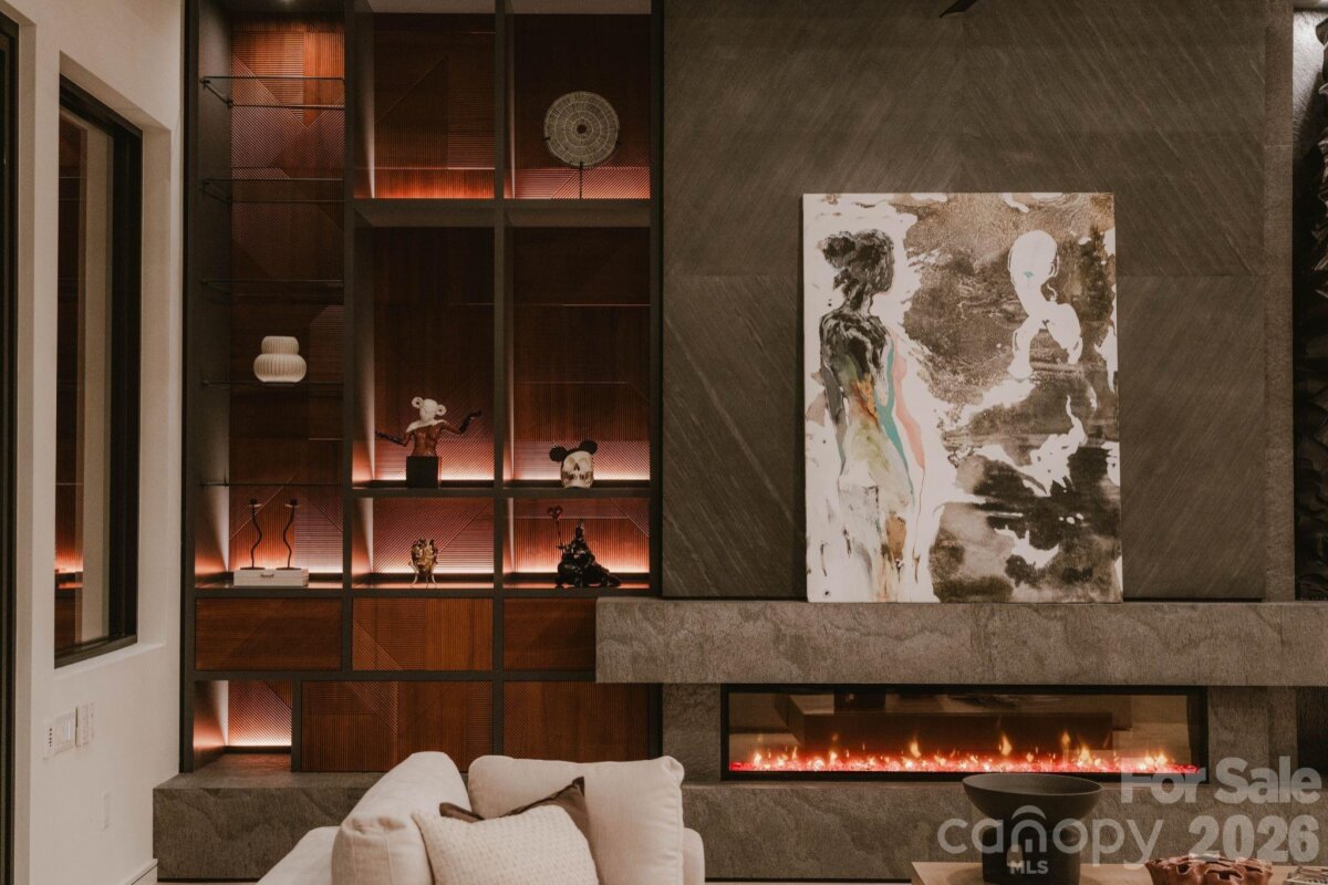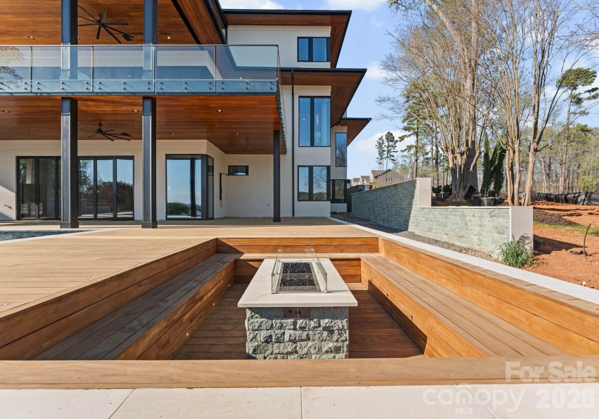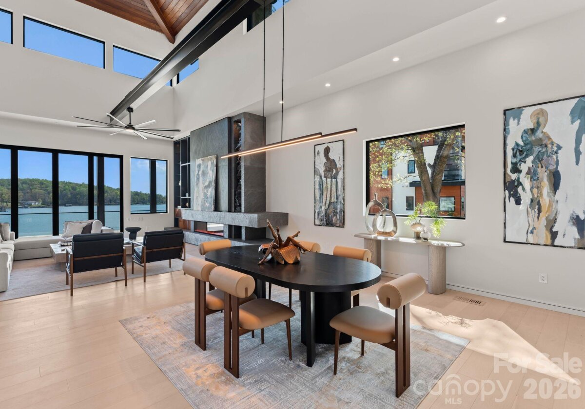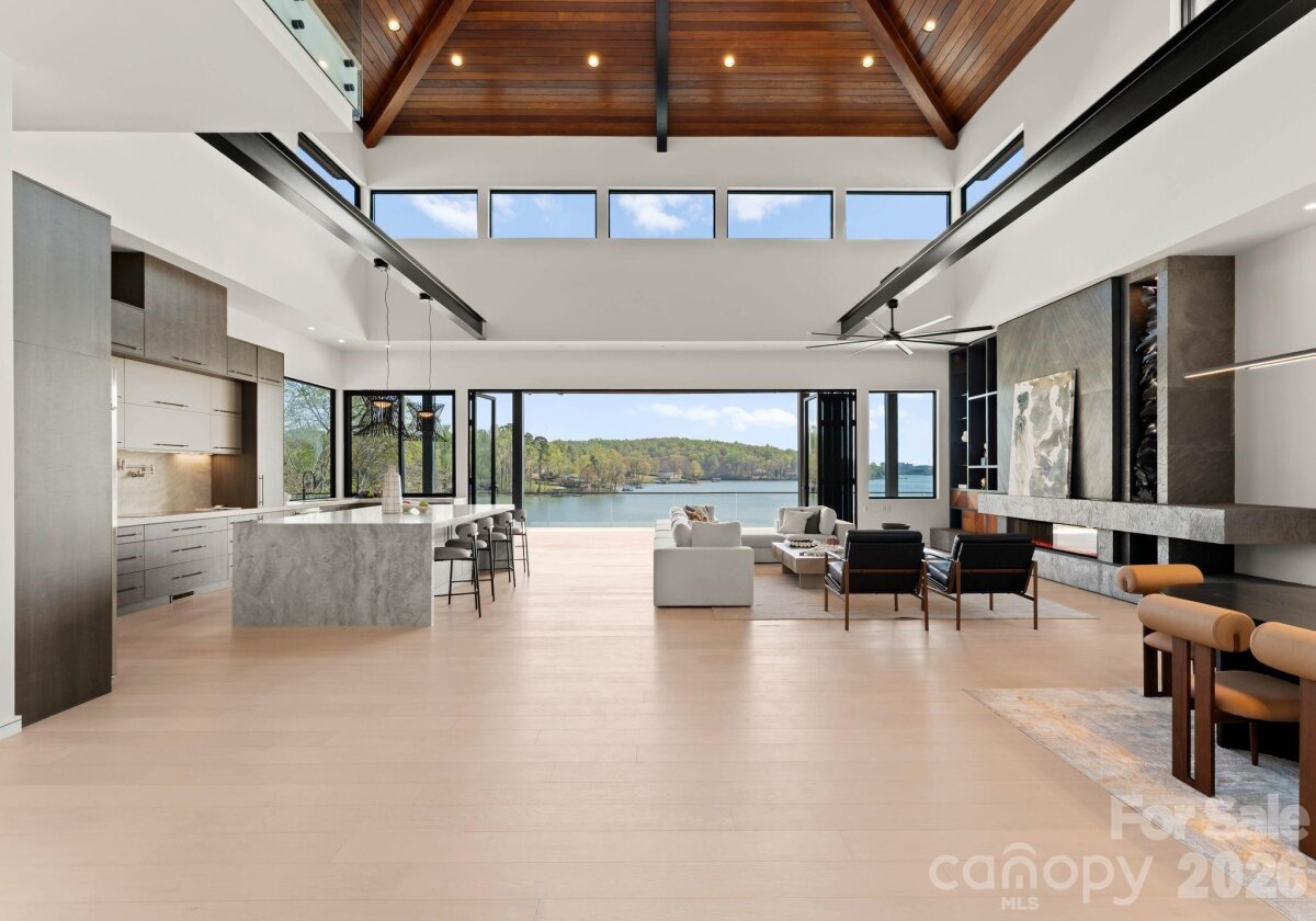 Exquisite Waterfront Masterpiece on Lake Wylie – Discover an architectural wonder just 20 minutes from Uptown Charlotte. Designed and built by Artistic Contractors, one of Charlotte’s premier design/build firms, this 8,300+ sq ft modern lakefront retreat embodies warmth, innovation, and serenity—offering a rare combination of world-class design and unmatched proximity to the city. Set on a gently sloping waterfront homesite beneath mature trees, this residence blends natural materials with bold geometry to create one of the most extraordinary private homes on Lake Wylie. Located just 5 minutes from Charlotte Douglas International Airport, this property delivers true convenience without compromise. Step through the monumental 10’ x 10’ pivot door into the breathtaking 1,400 sq ft atrium great room—a soaring, light-filled space combining living, kitchen, and dining beneath a dramatic 28-foot pyramidal clerestory ceiling clad in rich imported Peruvian cumaru wood. Exposed structural steel and a 24-foot folding glass wall seamlessly connect the interior to expansive covered terraces, creating one of the most architecturally striking living spaces in the region. The 6-bedroom, 5.2-bath home was designed with both luxury and livability in mind. The chef’s kitchen features a 10’ x 6’ waterfall island, professional Monogram appliances, Miele induction cooktop, and a concealed scullery. The great room is anchored by a 74†linear fireplace set against a dramatic wall of book-matched stone and custom wood paneling. A floating mono-stringer staircase with glass railing and 3†white oak treads serves as a sculptural centerpiece. The primary suite offers a true retreat with floor-to-ceiling glass capturing long-range lake views. The spa-inspired bath features a freestanding tub, oversized rain shower over a cumaru deck floor, and expansive custom closets with integrated lighting. Outdoor living is equally impressive, with over 1,800 sq ft of covered terraces finished with cumaru ceilings and imported Indonesian limestone flooring. Motorized screens, built-in audio, and a full outdoor kitchen create a seamless extension of the home. The resort-style infinity-edge pool and spa, finished in sukabumi stone, overlook Lake Wylie and are surrounded by thoughtfully designed landscape elements. Additional features include all-aluminum thermally broken windows and doors with low-E argon-filled 1" thick glass, spray foam insulation, tankless hot water, smart home integration, EV-ready three-car garage, and lake-fed irrigation system. Situated among a collection of high-end custom homes, this property represents a rare opportunity to own new construction of this caliber on Lake Wylie—often available at a compelling value relative to comparable homes on Lake Norman—while being just minutes from Uptown Charlotte, the airport, The River District, and nearby walking trails. This is more than a home—it is a statement of design, craftsmanship, and lifestyle.