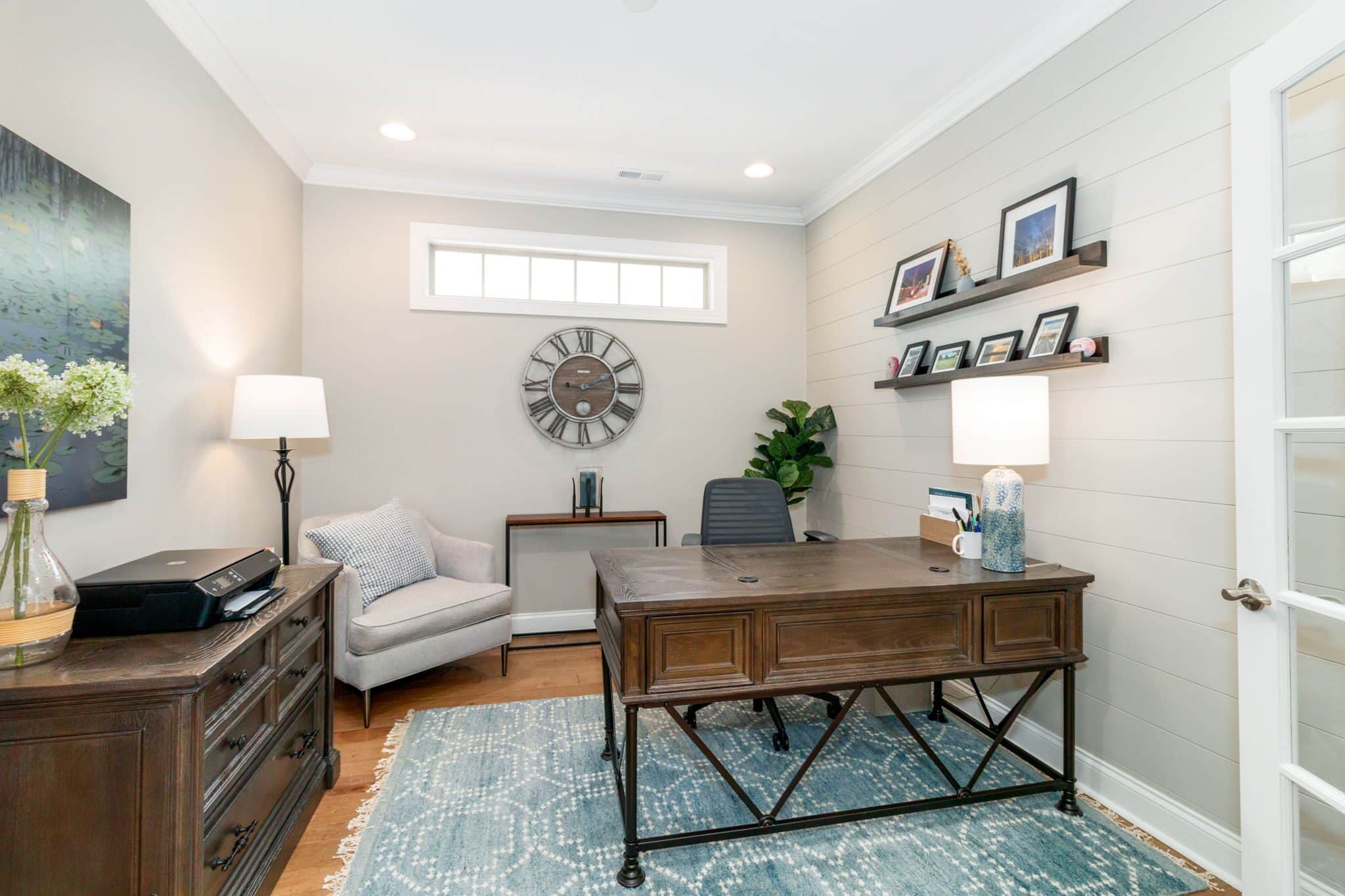 The main level of this Wesley Chapel home for sale is wrapped in natural light with Shaw engineered hardwoods, upgraded lighting, solid-core doors, and crisp trim. The family room centers on a gas fireplace with built-ins and added windows. A dedicated office with transom window and shiplap wall adds quiet workspace, while the screened porch extends easy living outdoors.