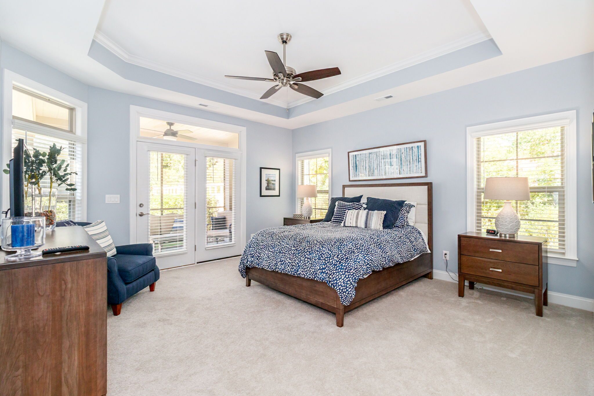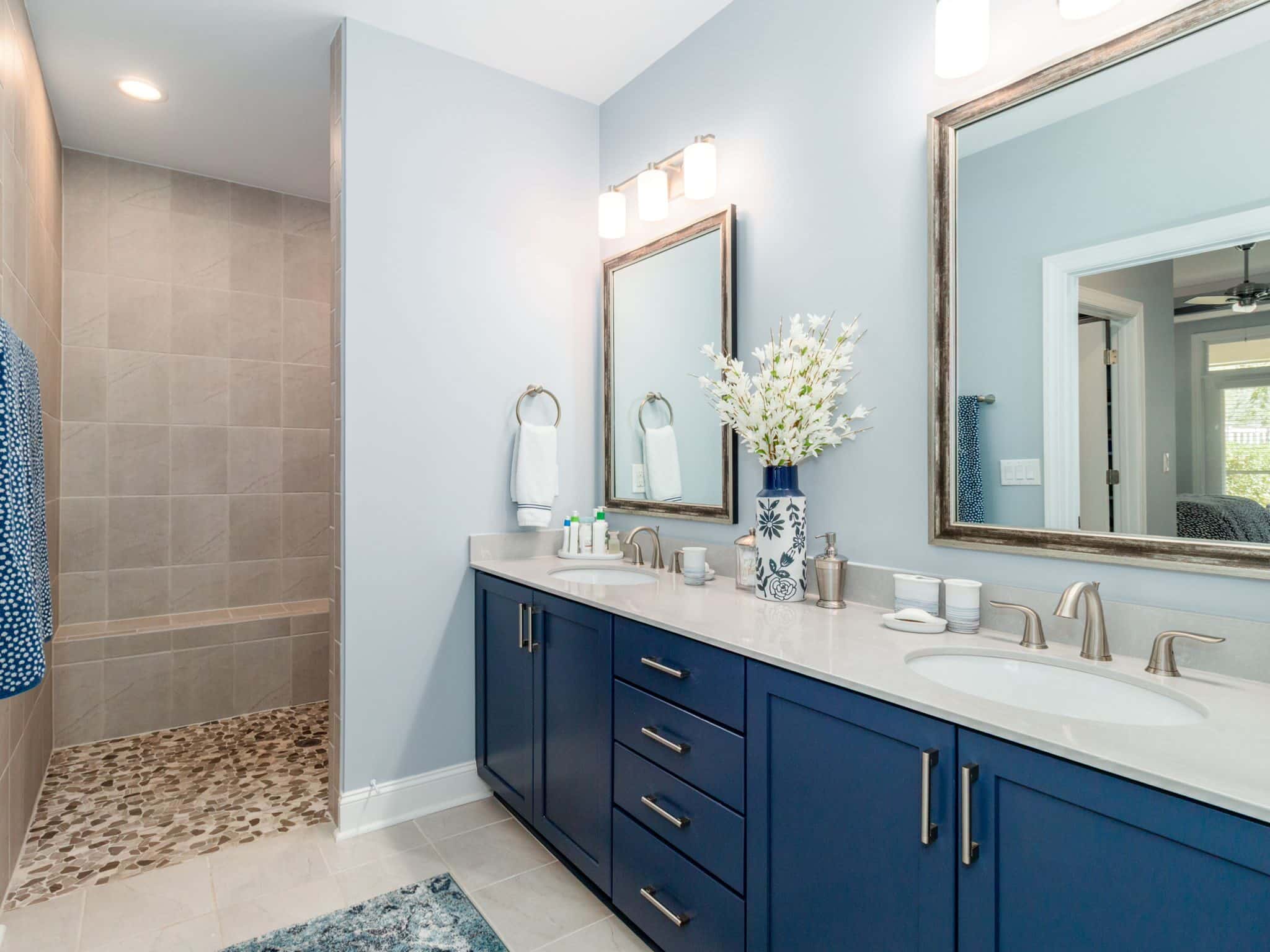 The primary suite includes tray ceiling, extra windows, and a zero-entry bath with pebble-tile floor, dual rain showerheads, and quartz countertops. A tankless water heater ensures endless hot water, and custom closet built-ins keep everything organized.
