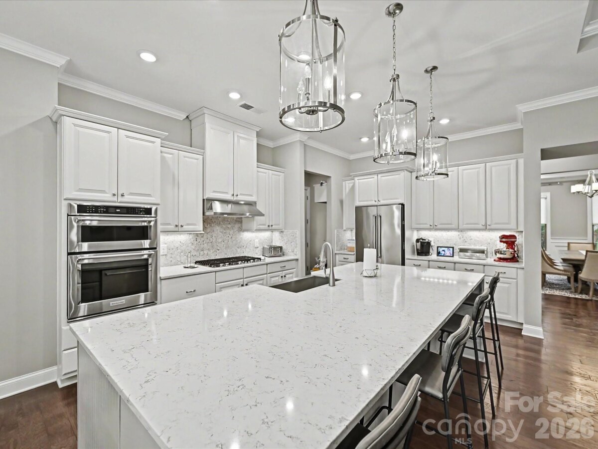 Welcome to unparalleled luxury in the highly sought-after Falls at Weddington, zoned for a highly rated, top-tier school district. As a former model home, this stunning full-brick estate masterfully blends sophisticated elegance with a warm, inviting ambiance, featuring a premium speaker system integrated throughout the home for effortless entertaining. The expansive main level boasts a seamless open floorplan, featuring a breathtaking gourmet kitchen with a sprawling island and walk-in pantry that flows effortlessly into the breakfast area and a magnificent great room anchored by a cozy fireplace. Entertain in the formal dining room or work with ease from the dedicated executive office. The lavish primary suite, conveniently located on the main floor, offers a private oasis complete with spa-like finishes and expansive walk-in closets. An additional main-level bedroom and full bath provide ideal, accessible accommodations for guests. Ascend to the upper level to discover three generously sized bedrooms, two full bathrooms, and a versatile media room perfect for private movie nights. Step outside to your serene exterior retreat featuring a beautifully crafted screened-in porch and an open patio. The meticulously manicured, level backyard is effortlessly maintained by an in-ground irrigation system. Complete with a pristine 3-car side-load garage, an expansive laundry room with a drop zone, and access to resort-style community amenities including a clubhouse, fitness center, and pool. This is more than a home; it's a lifestyle.
