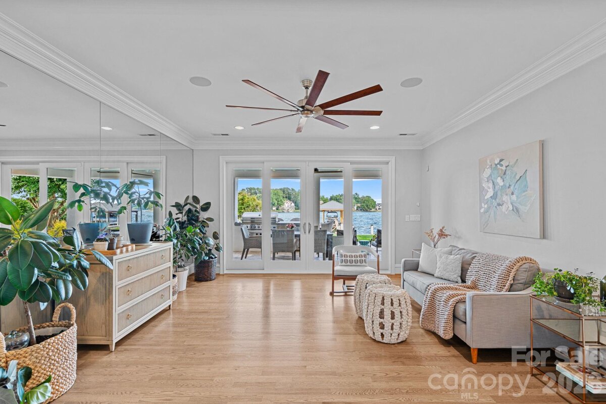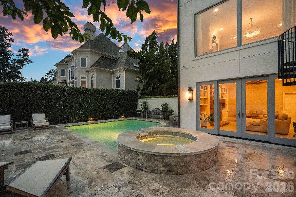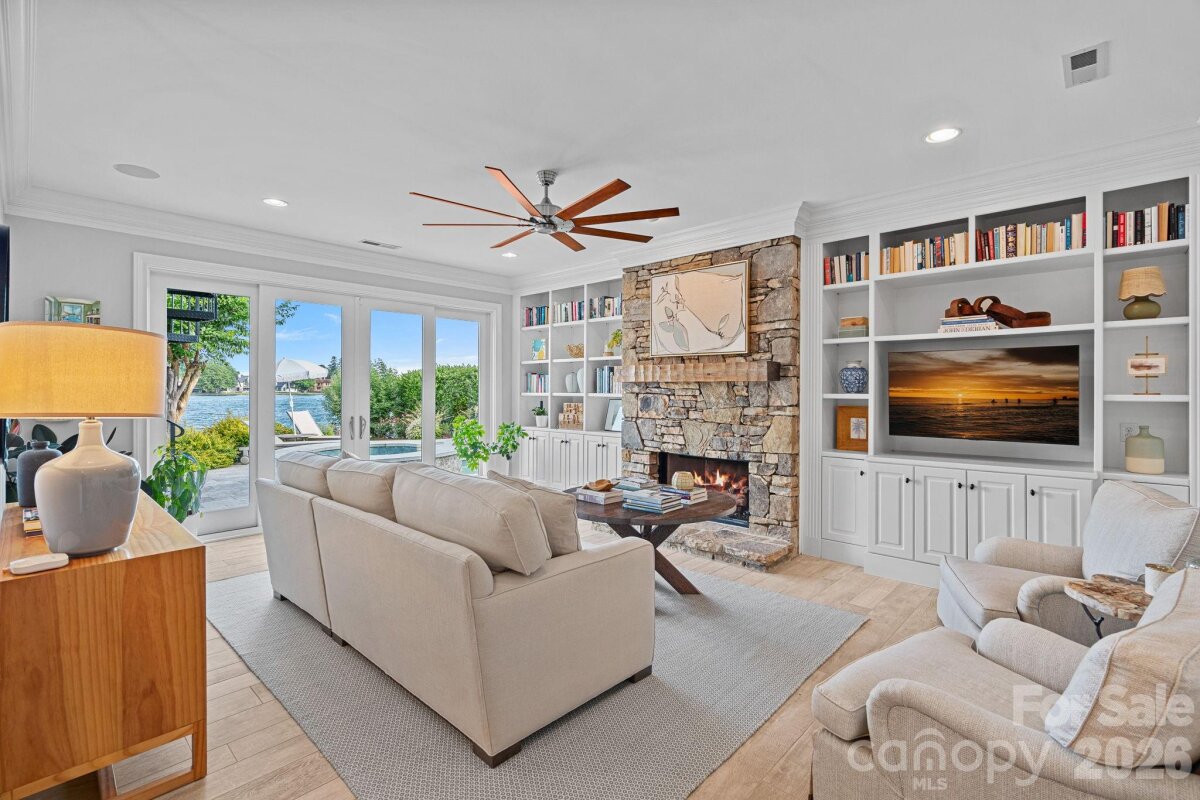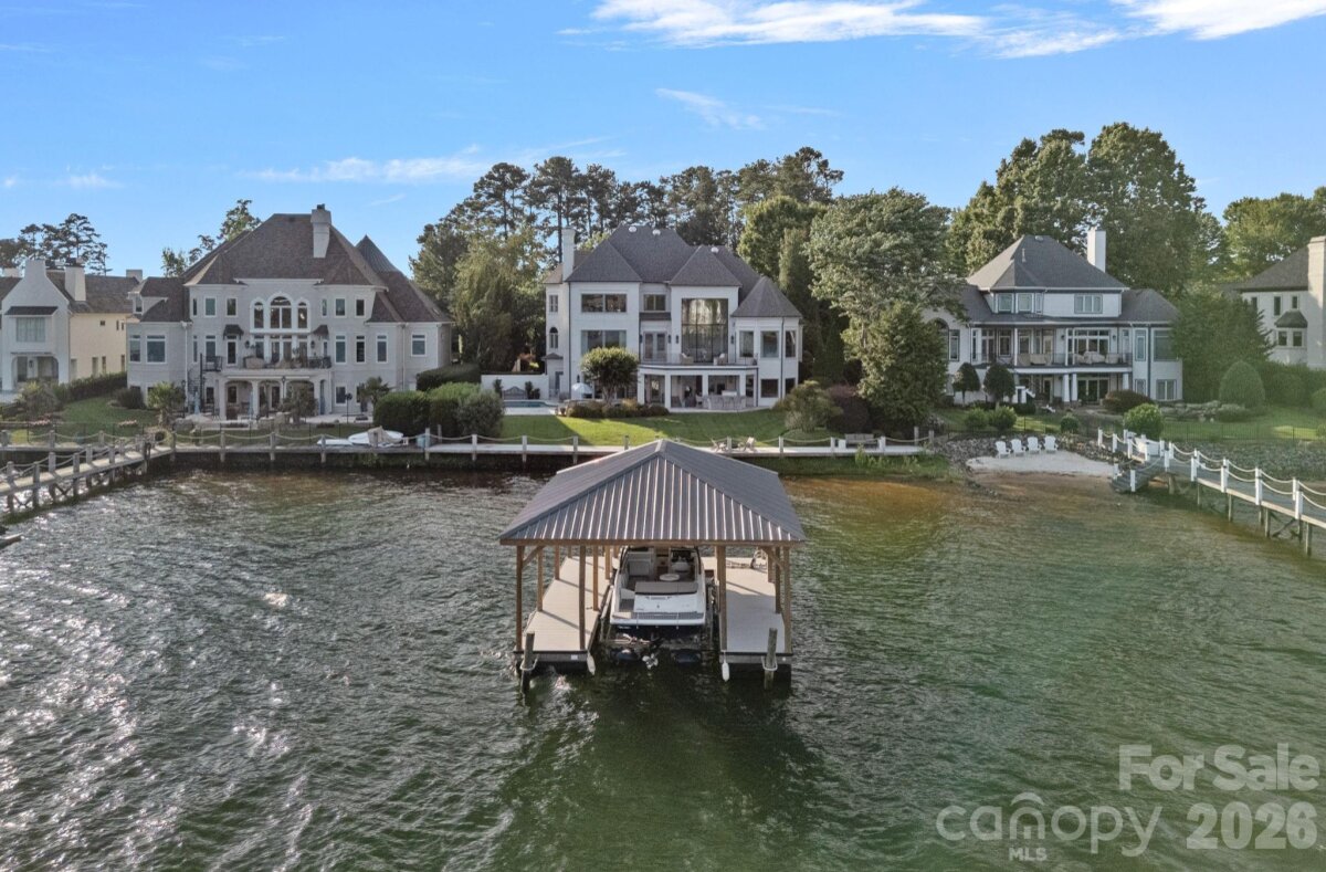 Experience designer waterfront living on one of the most coveted streets in The Peninsula. This rare turn-key estate offers over 6,000 sq ft of beautifully updated living space with 5 bedrooms and 6.5 baths, all thoughtfully designed with high-end finishes and striking designer lighting throughout. The open floor plan welcomes you with a dramatic two-story great room framed by expansive windows capturing breathtaking long-range Lake Norman views. A chef’s kitchen features a Wolf range with custom hood, dual wall ovens, Sub-Zero refrigerator/freezer, custom cabinetry with under-cabinet lighting, quartzite island, beverage bar, and an inviting keeping room overlooking the water. The main-level owner’s suite offers stunning lake views, private terrace access, and a spa-inspired bath with dual vanities, designer tile, quartz countertops, and a custom walk-in closet with marble waterfall island. A main-level guest suite and additional ensuite bedrooms provide comfort and privacy for family and guests. The walk-out lower level is designed for entertaining with expansive recreation space, billiards and poker areas, TV lounge, fitness room with lake views, pool bath access, and a lakeside storage garage. Situated on nearly ½ acre with approximately 100 feet of shoreline, the resort-style backyard features a custom pool, expansive terrace, covered patio with outdoor kitchen, professionally designed landscaping with lake-fed irrigation, and a deeded covered dock with 10,000 lb lift. A gated courtyard entry with fountain and a two-car garage with lift capability for four vehicles complete this exceptional property. Enjoy the ultimate Lake Norman lifestyle just a golf cart ride to The Peninsula Club, walking distance to the Yacht Club, and minutes from Jetton Park, shopping, dining, and Uptown Charlotte.