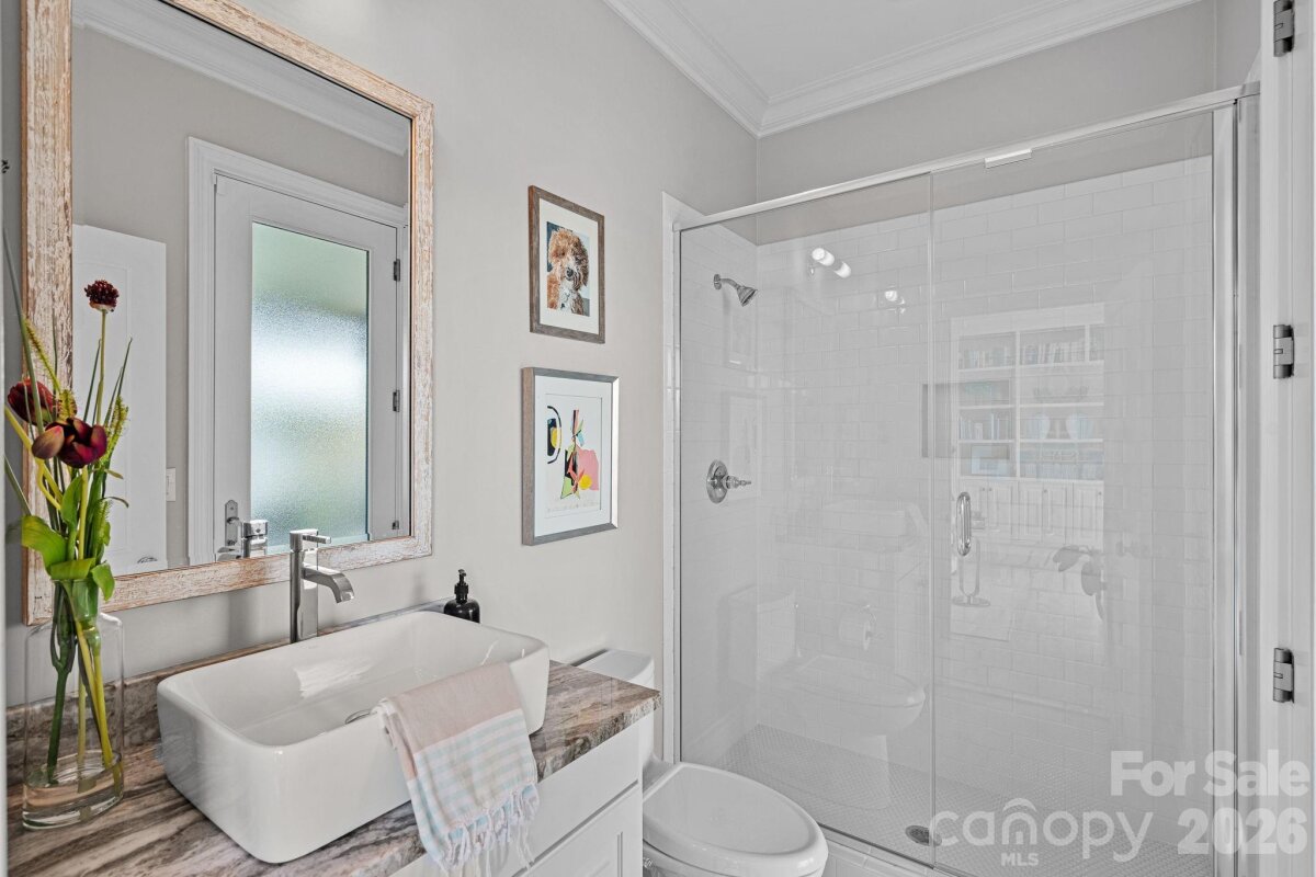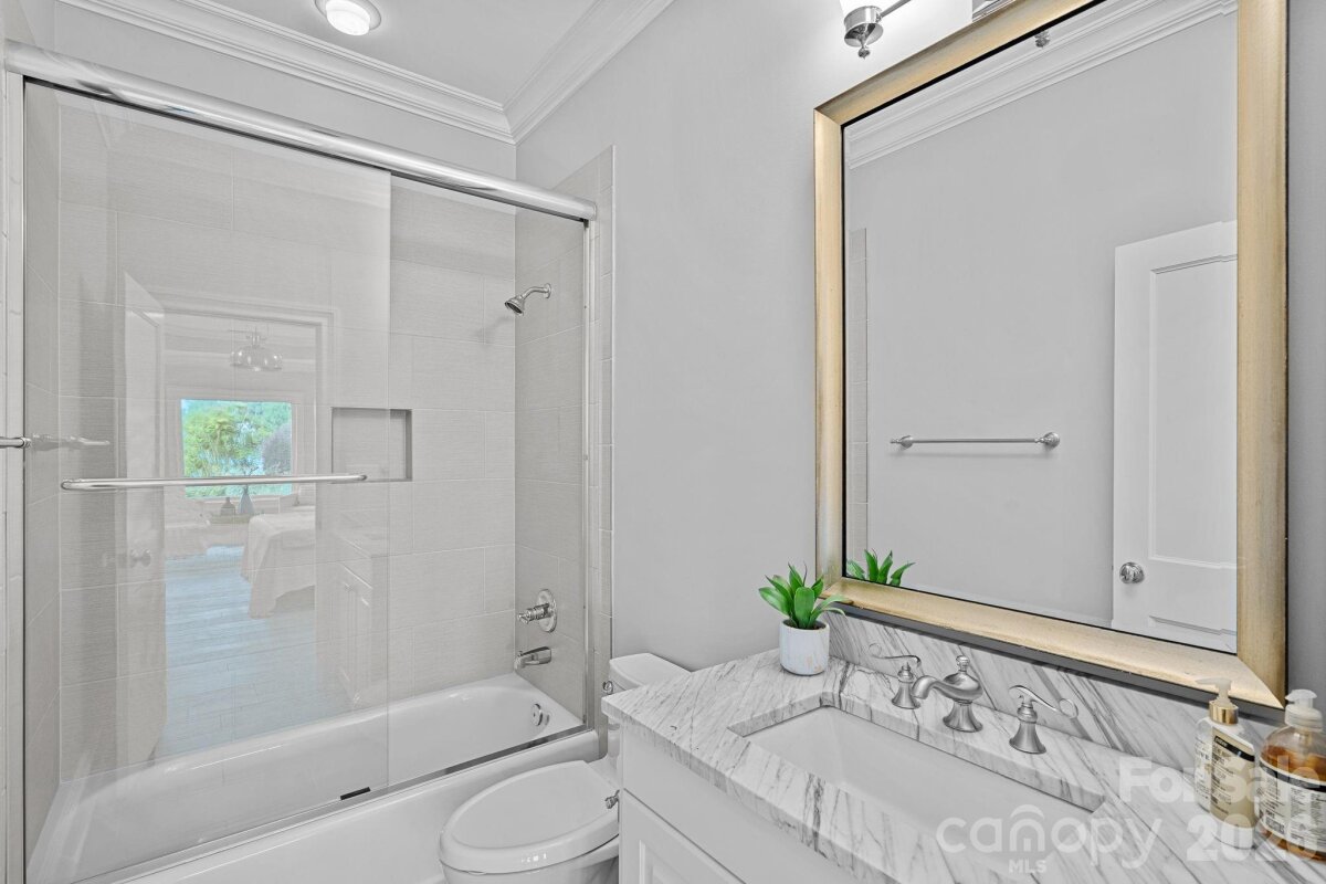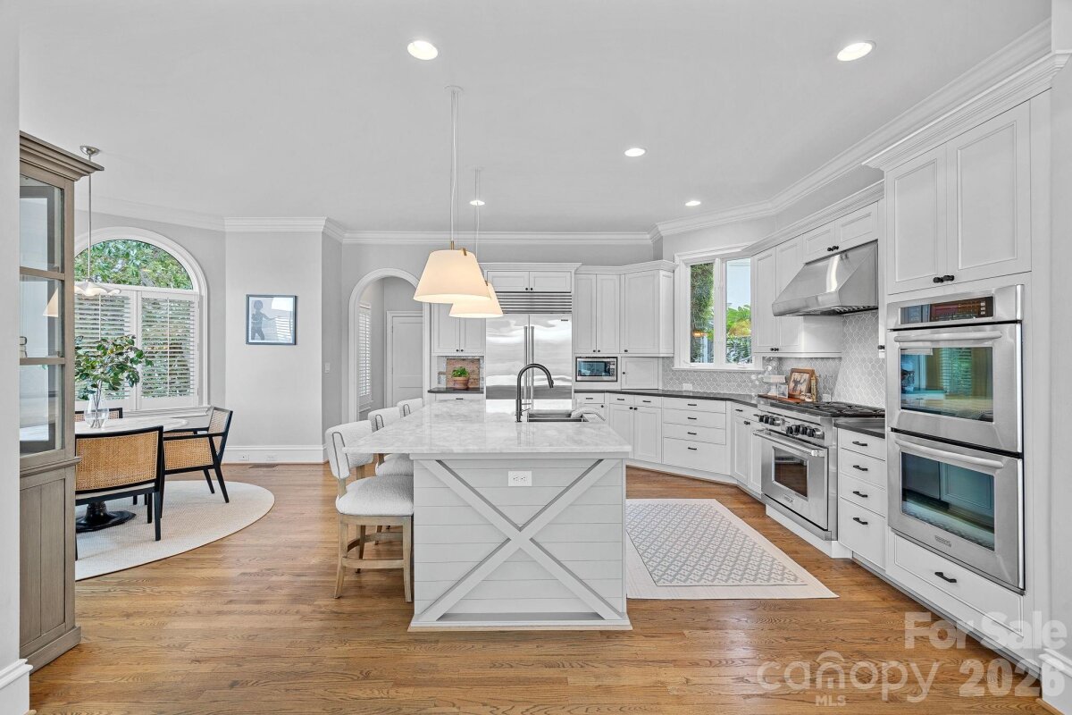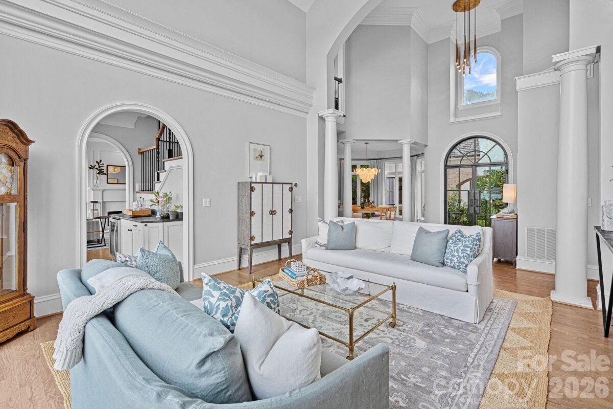 Experience designer waterfront living on one of the most coveted streets in The Peninsula. This rare turn-key estate offers over 6,000 sq ft of beautifully updated living space with 5 bedrooms and 6.5 baths, all thoughtfully designed with high-end finishes and striking designer lighting throughout. The open floor plan welcomes you with a dramatic two-story great room framed by expansive windows capturing breathtaking long-range Lake Norman views. A chef’s kitchen features a Wolf range with custom hood, dual wall ovens, Sub-Zero refrigerator/freezer, custom cabinetry with under-cabinet lighting, quartzite island, beverage bar, and an inviting keeping room overlooking the water. The main-level owner’s suite offers stunning lake views, private terrace access, and a spa-inspired bath with dual vanities, designer tile, quartz countertops, and a custom walk-in closet with marble waterfall island. A main-level guest suite and additional ensuite bedrooms provide comfort and privacy for family and guests. The walk-out lower level is designed for entertaining with expansive recreation space, billiards and poker areas, TV lounge, fitness room with lake views, pool bath access, and a lakeside storage garage. Situated on nearly ½ acre with approximately 100 feet of shoreline, the resort-style backyard features a custom pool, expansive terrace, covered patio with outdoor kitchen, professionally designed landscaping with lake-fed irrigation, and a deeded covered dock with 10,000 lb lift. A gated courtyard entry with fountain and a two-car garage with lift capability for four vehicles complete this exceptional property. Enjoy the ultimate Lake Norman lifestyle just a golf cart ride to The Peninsula Club, walking distance to the Yacht Club, and minutes from Jetton Park, shopping, dining, and Uptown Charlotte.