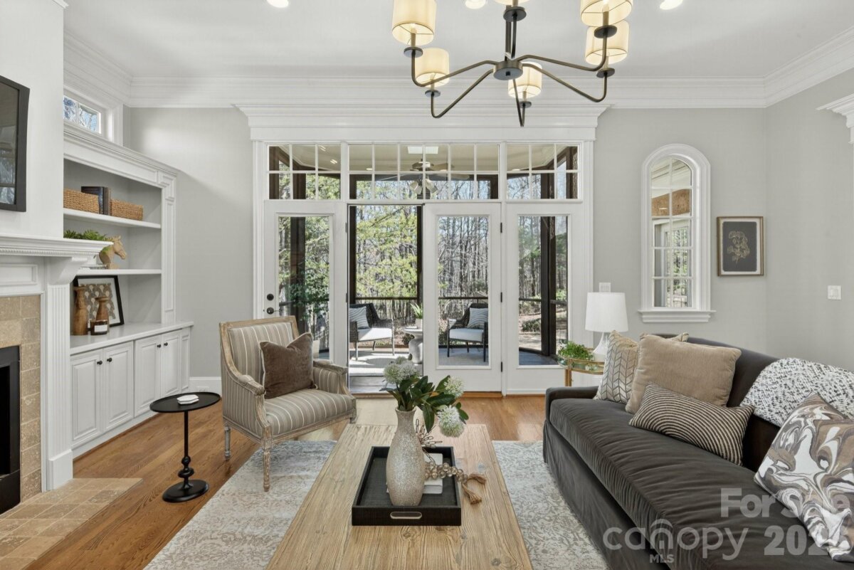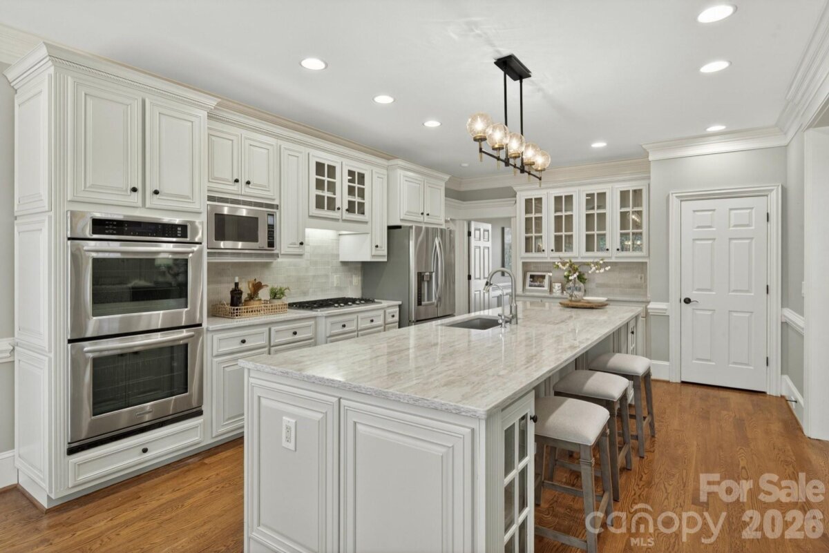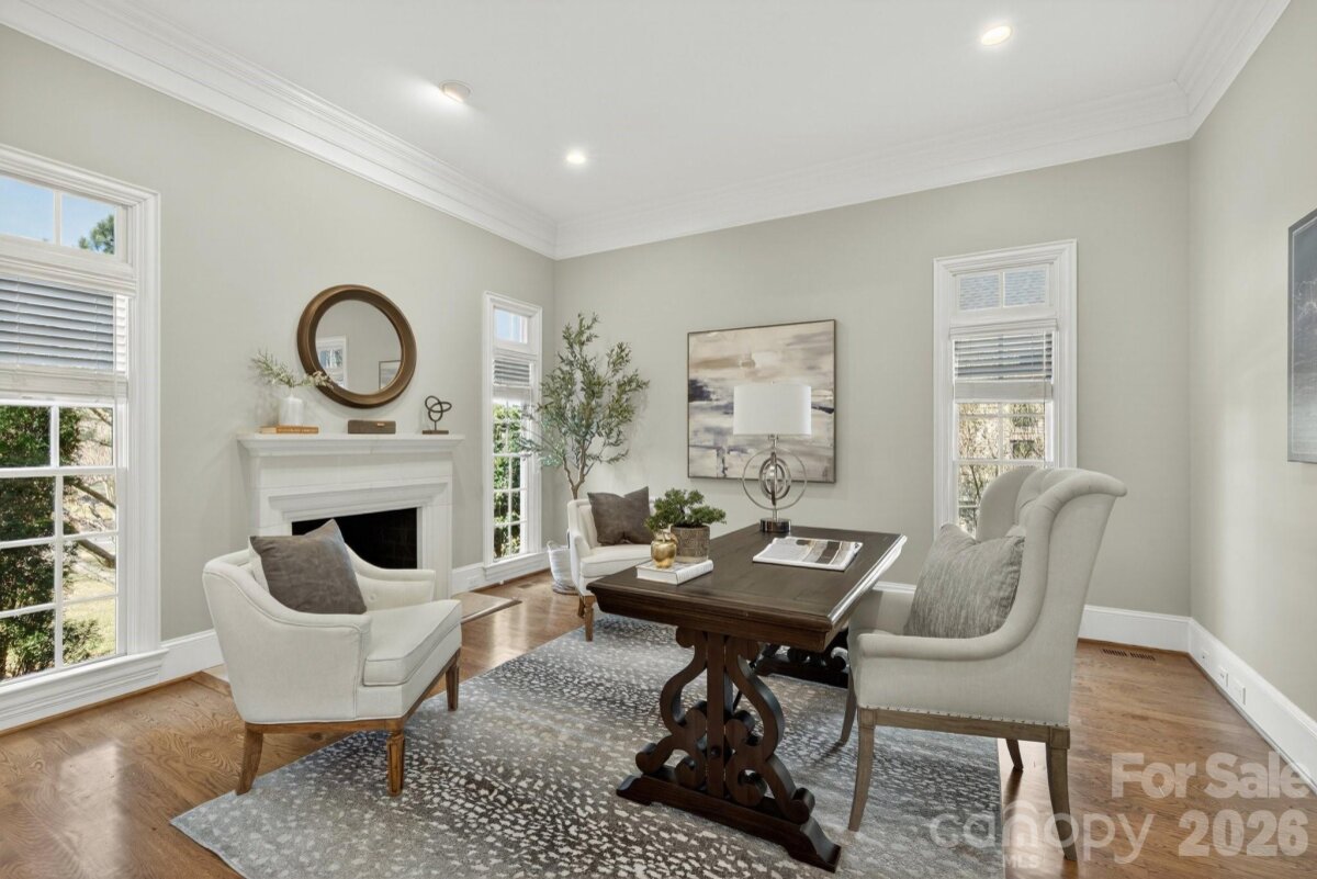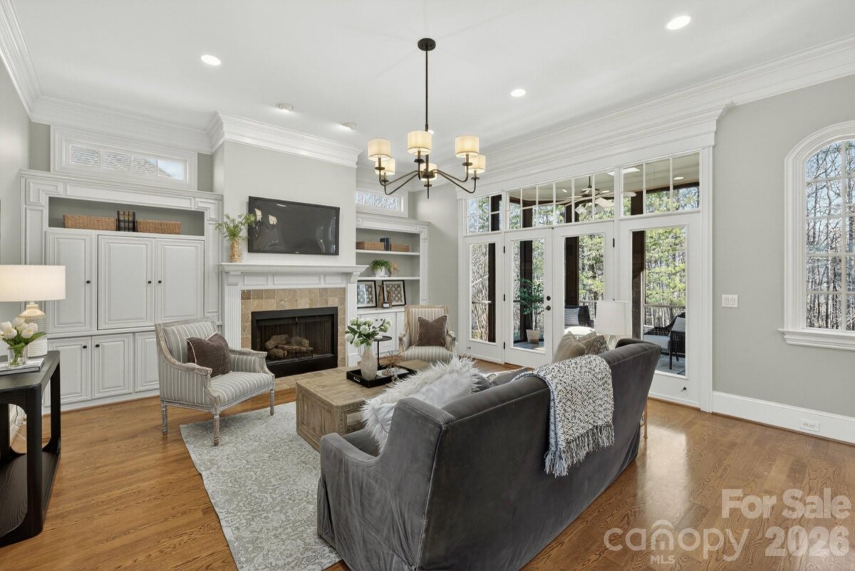 Discover refined living in this custom luxury residence located in Highgate, on of South Charlotte's most desirable communites. Set on over one acre of private, natural surroundings, this home combines quality craftsmanship with an exceptional location and just minutes from top-rated schools, dining, shopping, and recreation. A thoughtful floorplan showcases rich trimwork, high ceilings, and floor-to-ceiling windows that fill the home with natural light. The updated 2026 kitchen features quartz counters, a new backsplash, and freshly painted cabinetry, opening seamlessly to the main living areas for effortless everyday living and entertaining. The family room includes a fireplace, new lighting, and freshly painted built-ins, with direct access to the screened porch overlooking the quiet, fenced backyard. The main-level primary suite offers a spacious retreat with a tray ceiling, new lighting, large walk-in closet, and a well-appointed bath with separate vanities, a soaking tub, and ample storage. A cozy office/den with fireplace and an elegant dining room with wainscoting complete the main level. Upstairs, you’ll find generously sized bedrooms, two full baths, and versatile flex space, all freshly painted. Additional highlights include a circular driveway and three-car garage, enhancing both convenience and curb appeal. This Highgate home delivers luxury, comfort, and privacy in a premier location.